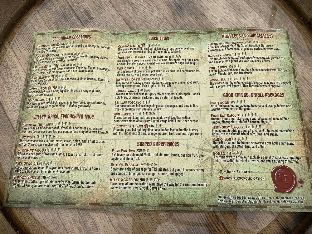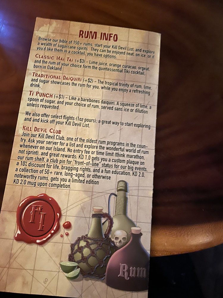 Introducing the menu at Forbidden Island, a vibrant and diverse rum bar located in Alameda, California. The establishment offers a wide range of amenities including outdoor seating, happy hour specials, and a full bar. The menu features a selection of premium rums from various regions such as Anguilla, Bermuda, and Barbados. Standout options include the English Harbor A 5 year copper still rum blend with notes of cherry and cinnamon, the Pyrat Cask 23 with flavors of sweet citrus and juicy fruit, and the Gosling's Old Rum aged in dark barrels for extra complexity. Each rum tells a unique story and provides a delightful experience for rum enthusiasts. Make sure to visit Forbidden Island on Friday, Saturday, or Sunday for the best nights and enjoy the laid-back atmosphere with your favorite drink in hand.